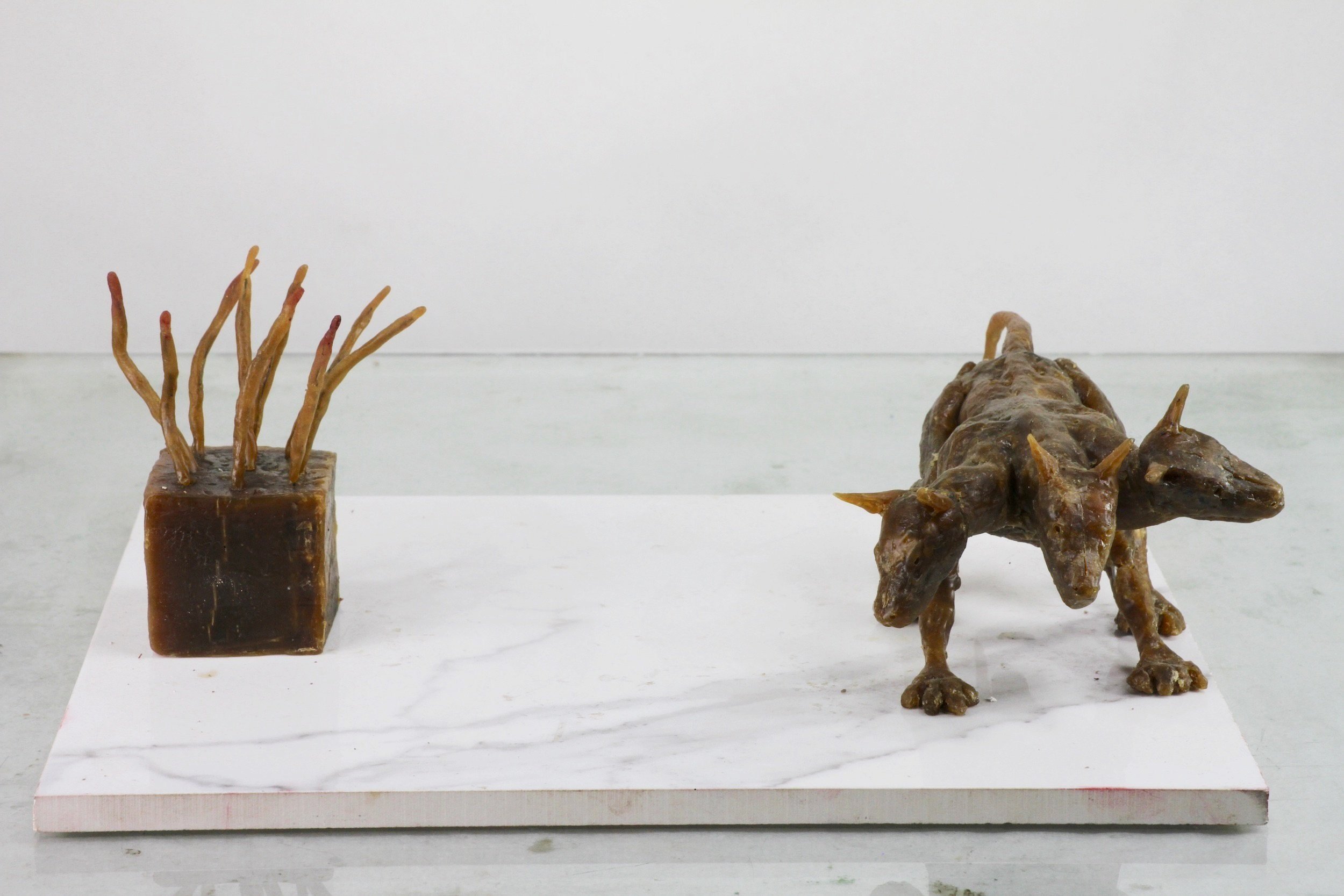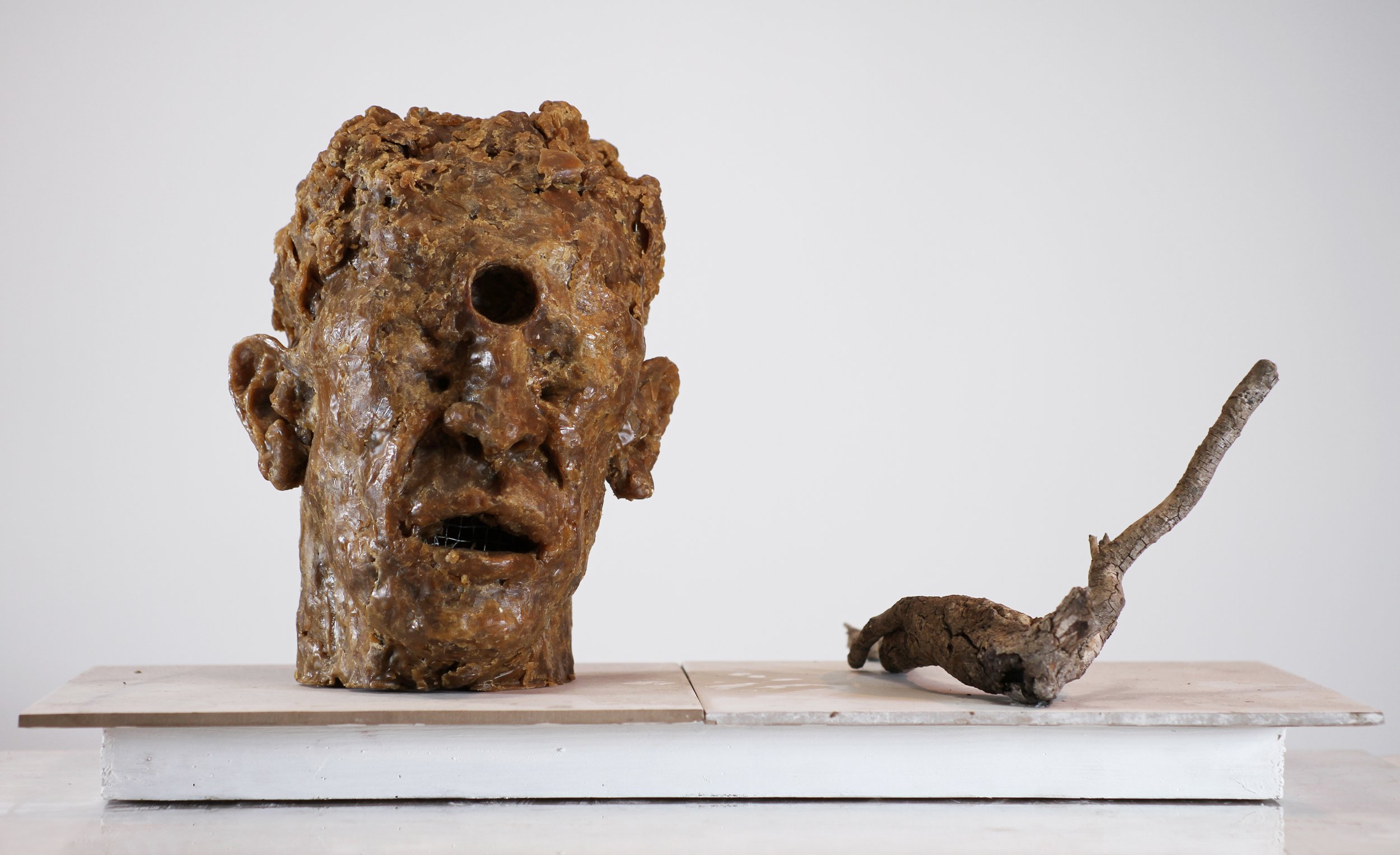 Wax, found tree branch, ceramic and painted wood base, 12 1/2 x 23 1/2 x 11 inches