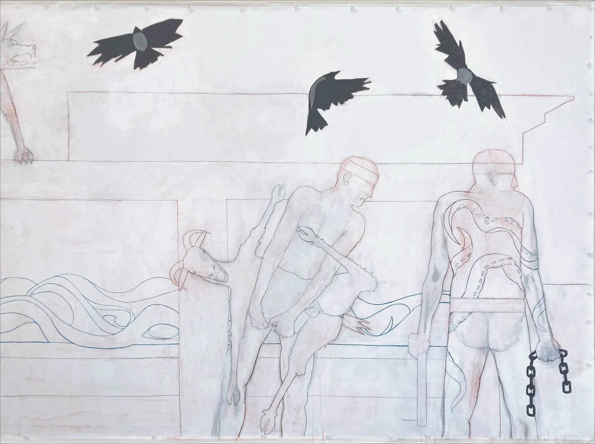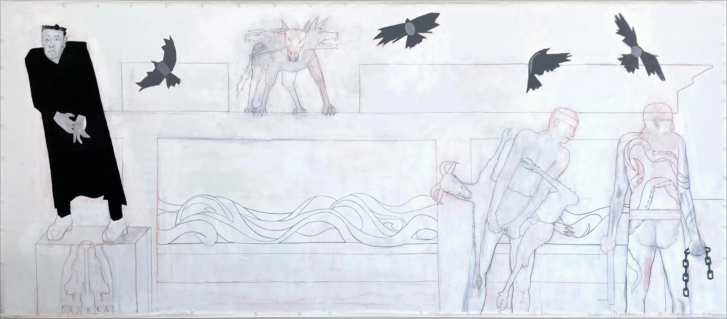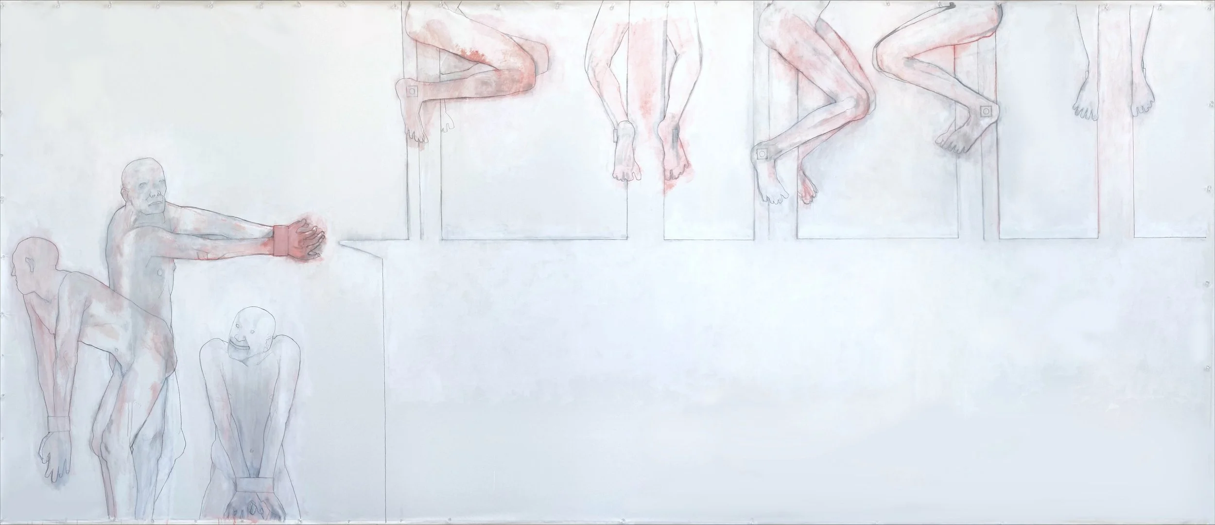 Flashe, gesso, acrylic, chalk, and graphite on canvas, 82 × 197 inches